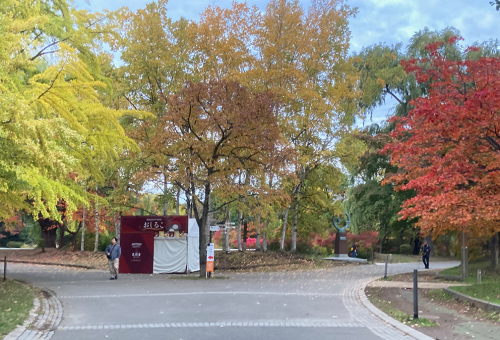 公園内には「さつま芋フェア」で出店のテントや秋の定番といった催し物が開かれ、焼き芋の香ばしい香りがより一層、秋を感じさせていました。 ホテルの庭には赤いサルビアやケイトウといった夏の花が植えられ紅葉とのコントラストが面白く、北海道の澄んだ空気に雪虫が飛んで冬の予感を感じました。